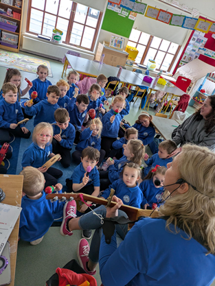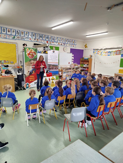 The infants are big fans of Aistear in the classroom (Play based learning). We recently had the Vet’s Surgery in the classroom and now our role play area is based on the Garden Centre. We were also lucky to get a visit from Garda Jimmy Cronolly who told us all about the job of a Garda and how important it is to help others. We always look out for our friends in school and we have been trying to help our community by caring for the environment. We take turns to bring home the litter picker to gather any litter and we also work hard at recycling in school.